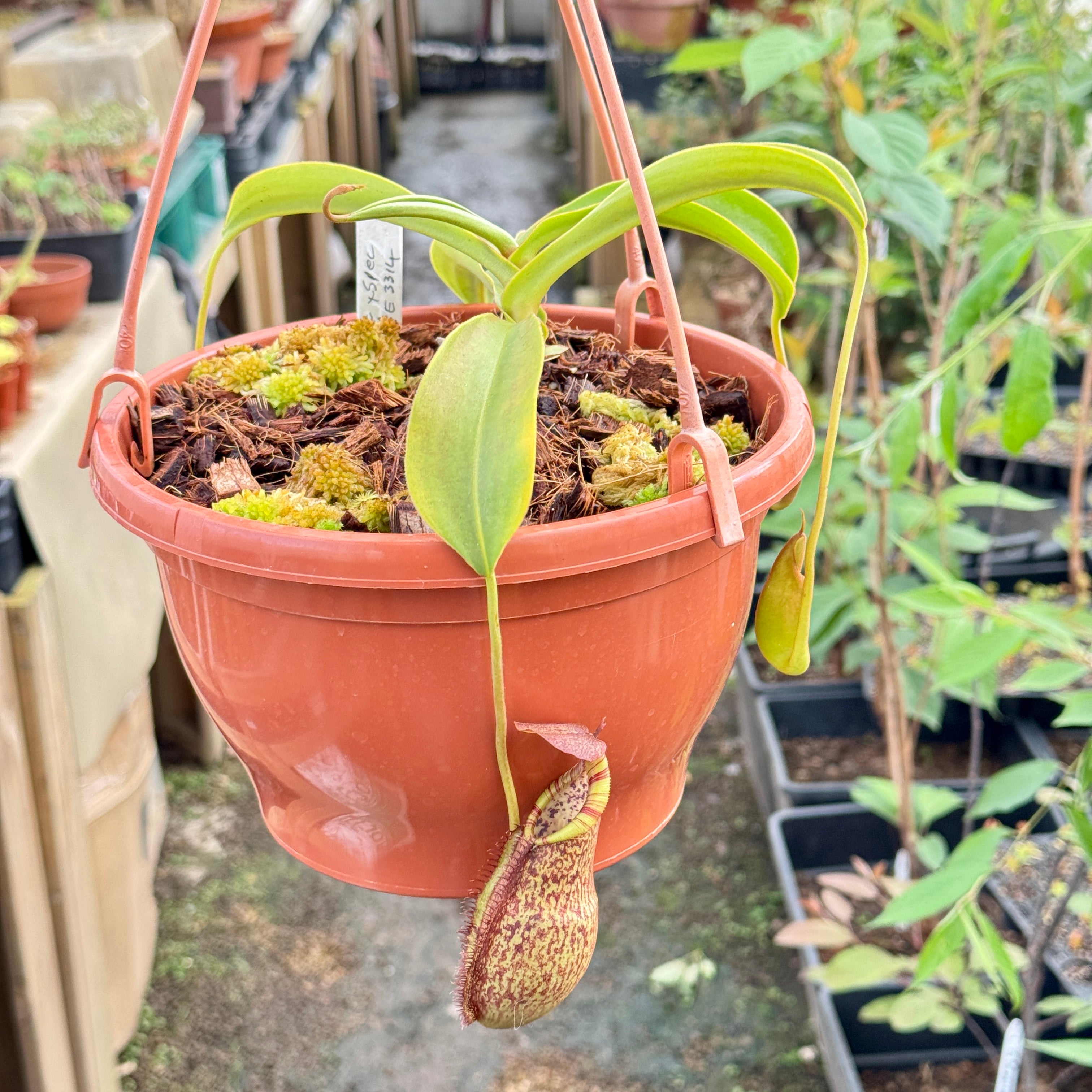Experience the magnificent combination of the stately shape and flared peristome of Nepenthes spathulata with the vibrant color from the Giant form of Nepenthes spectabilis. Bred by Borneo Exotics (BE-3314), these plants can thrive in various conditions, but truly flourish as an intermediate or cool grower. Enhance your home with this impressive plant, perfect for a sunny windowsill in any moderate climate.