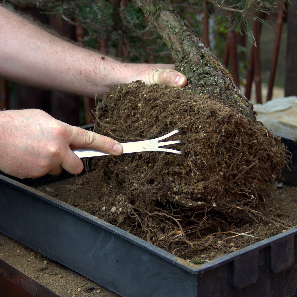 The rake can be used when repotting, to detangle the roots and remove old soil.