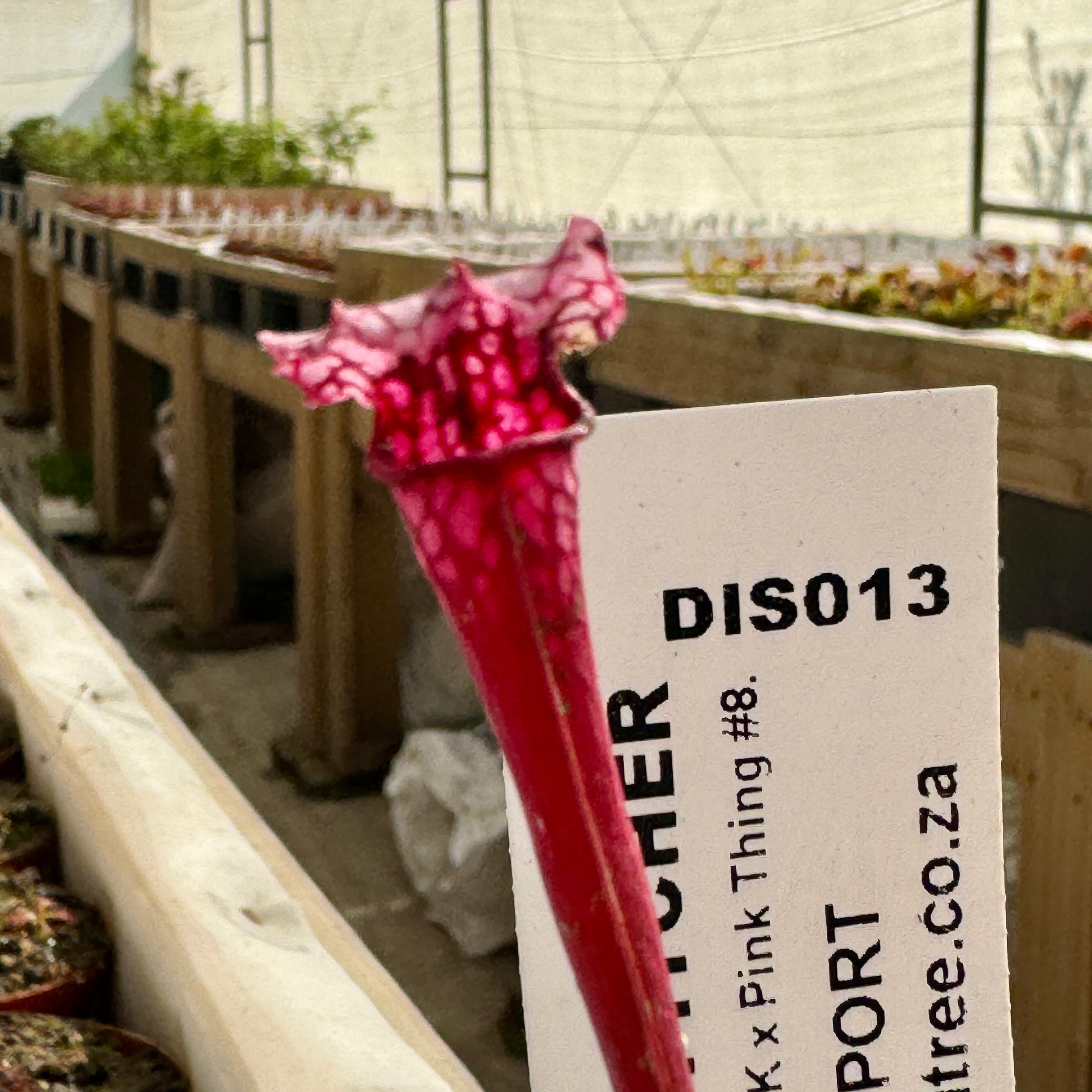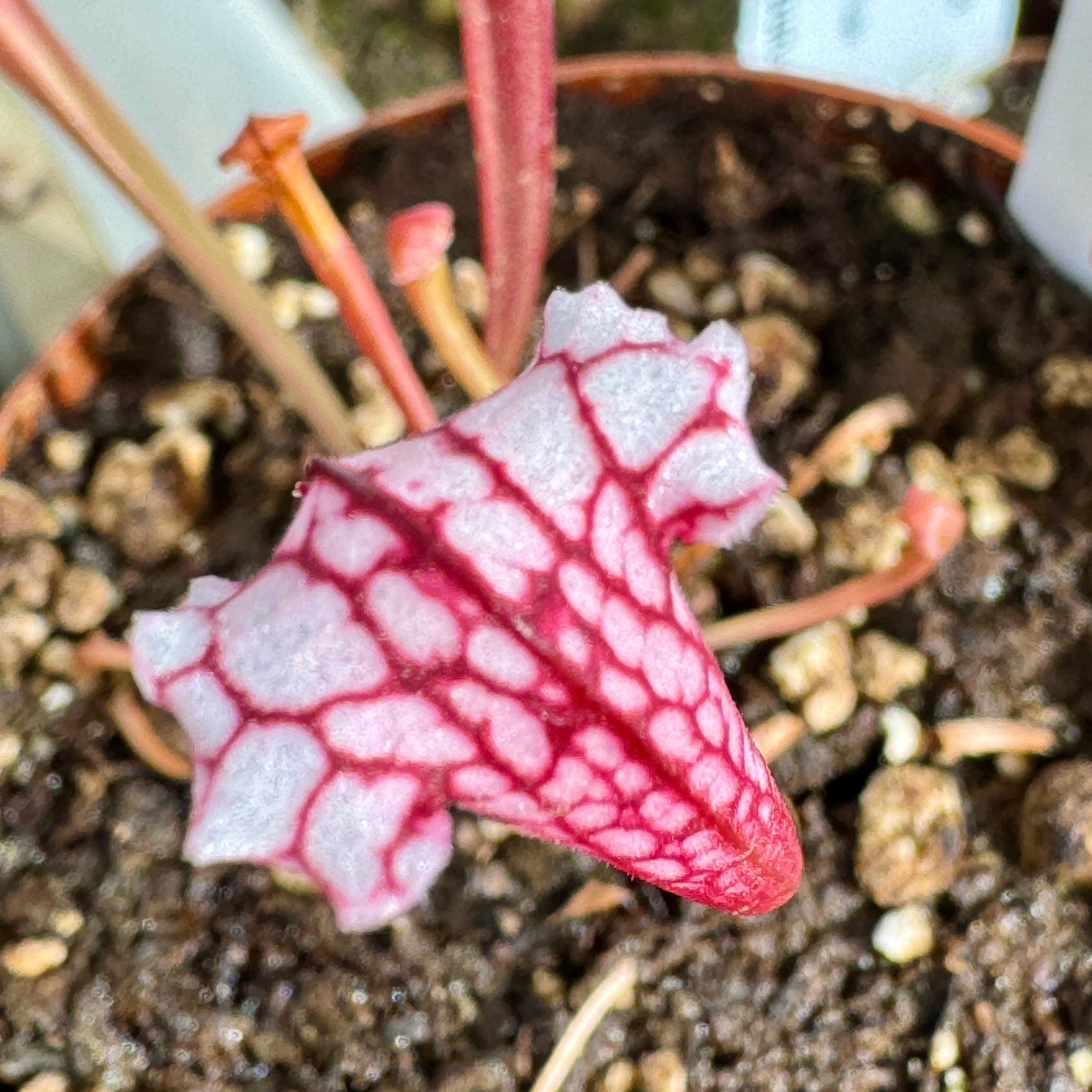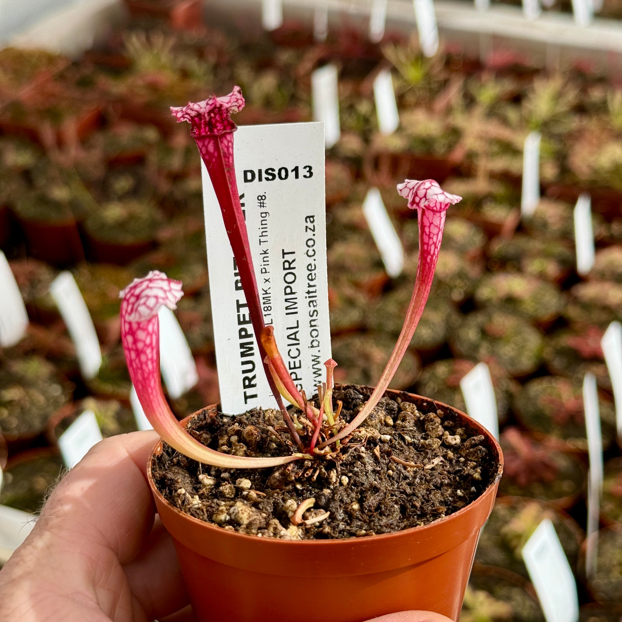Introducing the Trumpet Pitcher, Sarracenia 'Leucophylla L18MK x Pink Thing #8.' This remarkable specimen is a special import that brings a touch of nature's elegance and intrigue into your garden or home.